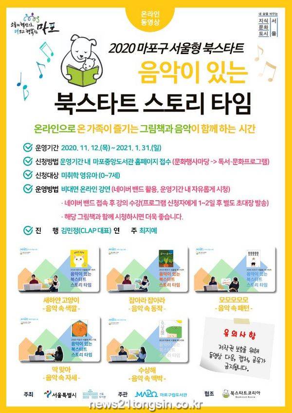마포구(구청장 유동균)는 양질의 북스타트 그림책과 음악이 함께하는 프로그램인 ‘음악이 있는 북스타트 스토리 타임’을 동영상으로 제작해 네이버 밴드를 통해 내년 1월 31일까지 무료로 제공한다고 밝혔다.