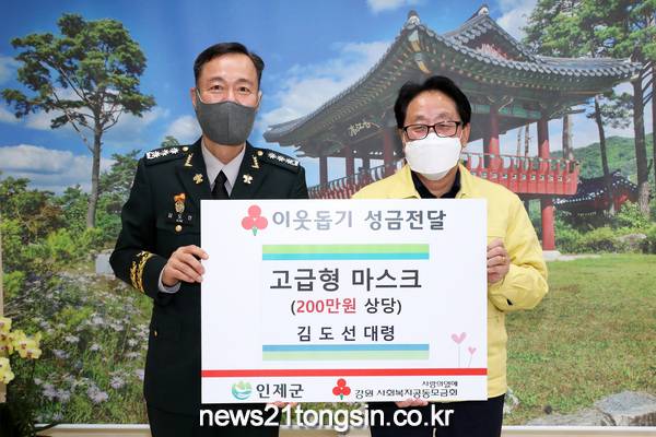 용인에 위치한 지상작전사령부 전투준비안전실장으로 근무하고 있는 김도선 대령이 지난 11일 인제군청을 방문해 고급형마스크를 기부하며 코로나19로 어려움을 겪고 있는 이웃들을 위해 써달라며 고향을 사랑하는 따뜻한 마음을 전달했다.