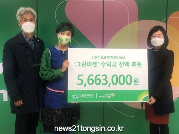 (재)강원문화재단(대표이사 김필국) 강원국제예술제 운영실은 15일 오전 9시 강원문화재단 회의실에서 초록우산 어린이재단 강원지역본부(본부장 고주애)와 함께 강원키즈트리엔날레2020 그린마켓 운영 수익금 전달식을 가졌다.