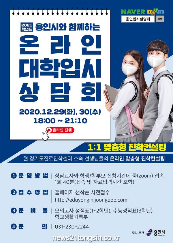 용인시는 16일 2021학년도 대입 정시모집에 대비해 29‧30일 18~21시 온라인으로 진행되는 입시 컨설팅에 수험생과 학부모 등 참가자 240명을 모집한다고 밝혔다.