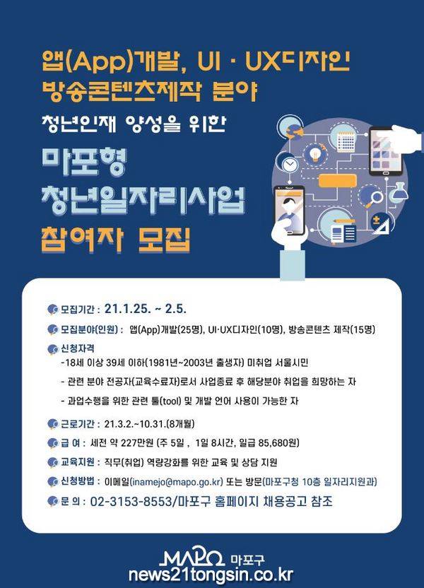 마포구(구청장 유동균)는 신종 코로나바이러스 감염증(코로나19)의 여파로 취업에 어려움을 겪고 있는 청년들을 대상으로 우리 지역 기반 산업(IT‧방송‧디자인) 분야에 대한 청년일자리 사업 참여자를 모집한다고 밝혔다.