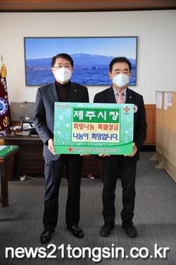 안동우 제주시장은 2월 3일(수), 대한적십자사 제주특별자치도지사(회장 오홍식)에 2021년 적십자 특별회비 전달로 희망 나눔의 문화를 전파에 동참했다.