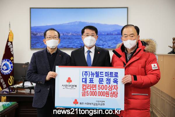 제주시에서는 5일, ‘㈜뉴 월드 마트 (대표 문정옥)’에서 설 명절을 맞아 지역의 어려운 이웃에게 전달해달라며 컵라면 500상자(500만원 상당)를 제주시에 방문하여 기탁했다고 밝혔다.