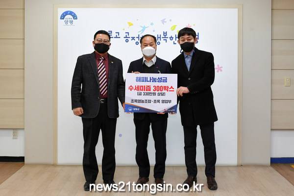 이에 정동균 양평군수는 “코로나19의 장기화로 모두가 힘든 시기이지만 지역사회를 위해 나눔을 실천해주신 초록영농조합&초록영업부(대표 임청우)에 감사드린다. 또한 코로나19로 가족들과의 만남도 취소하는 등 쓸쓸한 명절이 될 뻔 했는데, 나눔을 실천해 주시는 분들 덕분에 마음만은 따뜻한 명절이 된 것 같다.”라고 전했다.