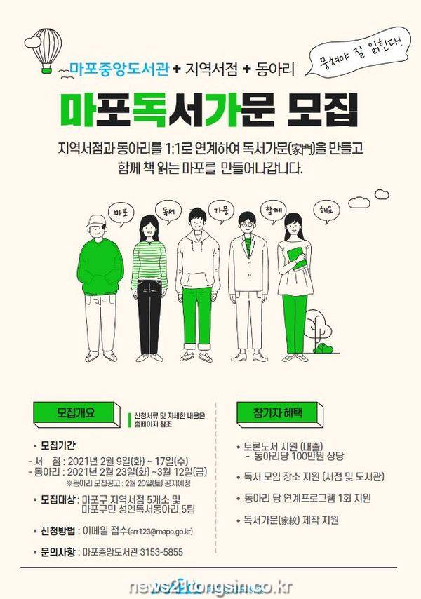 신청자격은 마포구 지역서점 및 마포구 지역 주민 10~15인으로 구성된 독서동아리로 서점은 오는 17일까지, 동아리는 2월 23일부터 내달 12일까지 모집한다.