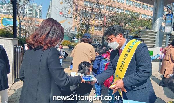 이날 김정원 수지구청장과 구청 직원 7명은 어린이 하교시간에 운전자들과 학부모를 대상으로 어린이 안전사고 예방을 위한 불법 주·정차 금지를 당부했다. 이와 함께 인근 상가들을 방문해 홍보물을 배부했다.