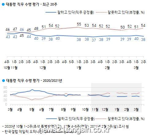 ▲  [자료제공 = 한국갤럽]문재인 대통령의 국정수행 지지율이 다시 40% 아래로 떨어졌다는 여론조사 결과가 12일 나왔다. 부동산 정책에 대한 악화 여론이 이어지는 가운데 한국토지주택공사(LH) 직원의 신도시 사전투기 의혹도 영향을 미친 것으로 해석된다.