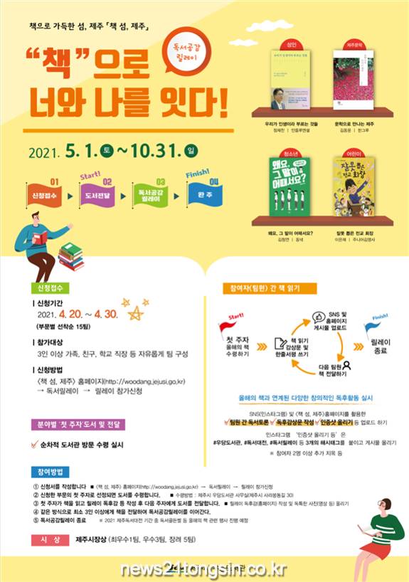 참가신청은 오는 30일까지 「책 섬, 제주」홈페이지(http://woodang.jejusi.go.kr)에서 가능하며 독서공감 릴레이 도서는 도서관에서 방문 수령하면 된다.