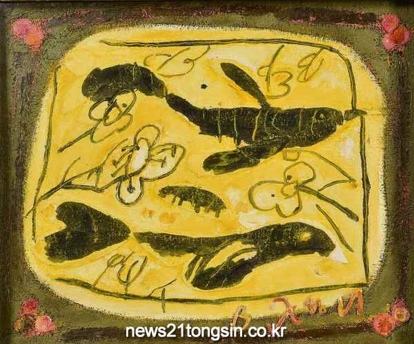 ▲ 변종하, 두 마리 고기, 1980, 50.6×61.3cm, Oil on plaster board
