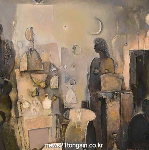 ▲ 문학진, 달, 여인, 의자, 1988, 130.3x130.3cm, 캔버스 에 유채