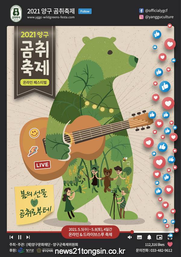 올해 곰취축제는 온라인 이벤트 뿐만 아니라 브이로그, 곰취 농가체험, 펀치볼 트레킹, 곰취쿡방, 라이브 커머스 등 다양한 프로그램을 선보인다. 또 양구레포츠공원에서 드라이브스루 방식으로 곰취를 판매할 계획이다.