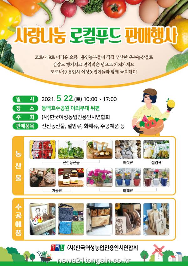 용인시는 오는 22일 (사)한국여성농업인용인시연합회가 기흥구 중동 동백호수공원 야외무대 뒤편에서 ‘로컬푸드 판매행사’를 개최한다고 밝혔다.