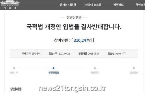 ▲ [이미지출처 = 국민청원 게시판 캡처]정부가 추진하는 국적법 개정에 대한 반대 여론이 거세다. 청와대 국민청원 게시판에 올라온 국적법 개정 철회 글에는 국민들의 동의가 31만을 넘어섰다.