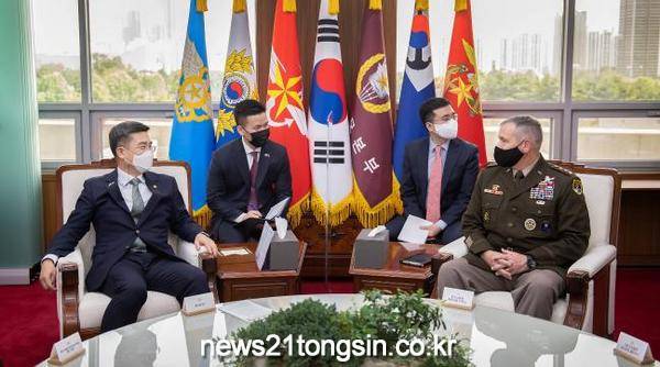 ▲ 서욱 국방부 장관이 지난달 24일 제임스 디킨슨미 우주사령관을 접견서욱 국방부장관이 전날인 4일 오후, 방한 중인 미국 상원의원 대표단을 만나 한반도의 비핵화와 항구적인 평화정착을 위한 한미간 협력과 한미동맹의 발전방향에 대해 논의했다.