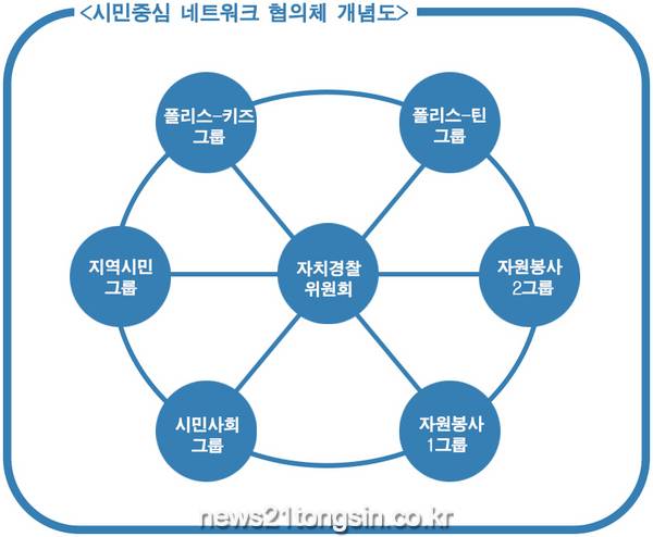 ▲ 시민중심 네트워크 협의체 개념도자치경찰위원회는 시민, 시민단체, 자원봉사단체, 아동, 청소년 등 다양한 시민사회 구성원들과 함께 거버넌스를 구성해 자치경찰 치안정책에 관한 양방향 소통을 이어가겠다는 계획이다.