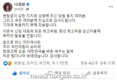 나 전 의원은 "변함없이 강한 지지로 성원해주신 당원동지 여러분, 국민 여러분께 진심으로 감사드린다. 기대에 부응하지 못해 죄송하다"고 말했다.