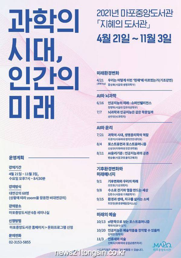 마포구(구청장 유동균)는 마포중앙도서관에서 ‘과학의 시대, 인간의 미래’를 주제로 코로나19 및 4차 산업혁명으로 앞당겨진 미래를 살펴보는 시간을 마련한다고 밝혔다.