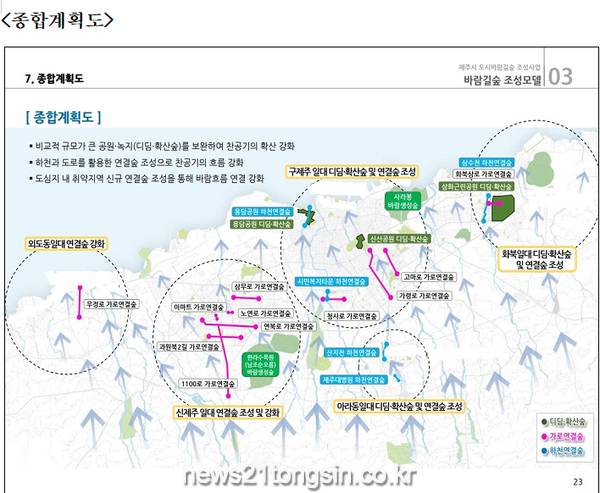 올해 1차년도 사업비 50억원이 투입되는 도시바람길숲은 신제주, 구제주, 화북권역으로 나뉘어 시행되며 권역별로 확산숲, 연결숲 등 다양한 기능의 도시숲을 조성하게 된다.