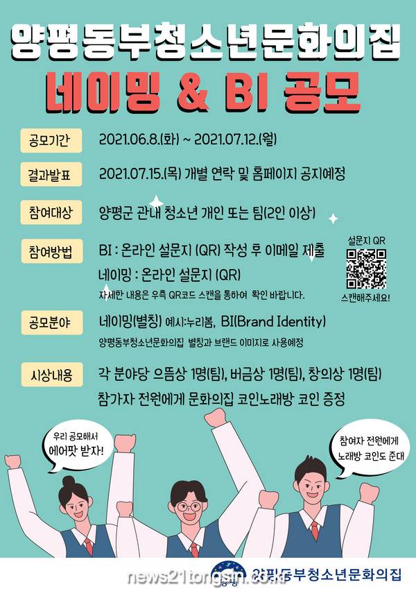 한편 개관을 앞둔 양평동부청소년문화의집은 청소년들이 직접 지은 별칭과 브랜드 이미지를 사용하고자 청소년들을 대상으로 네이밍(별칭)&BI 공모전이 진행하고 있다. 접수기간은 7월12일(월)까지이며, 수상자 발표는 7월22일(목)에 개별 연락 및 홈페이지를 통하여 공지될 예정이다. 접수방법은 구글 설문지(https://forms.gle/9ospRsffF1tanQQ29) 및 이메일(ydyouthcenter@naver.com)을 통하여 할 수 있다.