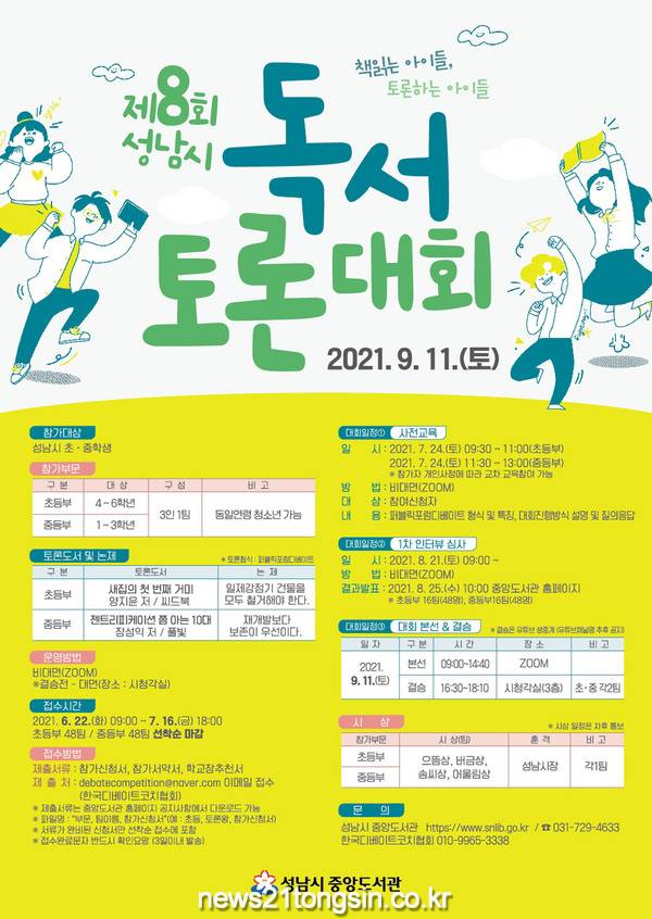 온라인(Zoom) 인터뷰 심사와 본선을 통과하는 4개 팀(초·중 각 2개 팀)이 오는 9월 11일 오후 분당구 야탑동 중앙도서관에서 열리는 성남시 독서토론대회 결승을 치른다.