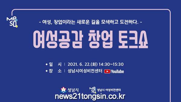 성남시(시장 은수미)는 오는 6월 22일 오후 2시 30분 여성비전센터 유튜브를 통해 시민 누구나 참여할 수 있는 온라인 ‘여성 공감 창업 토크쇼’를 개최한다.