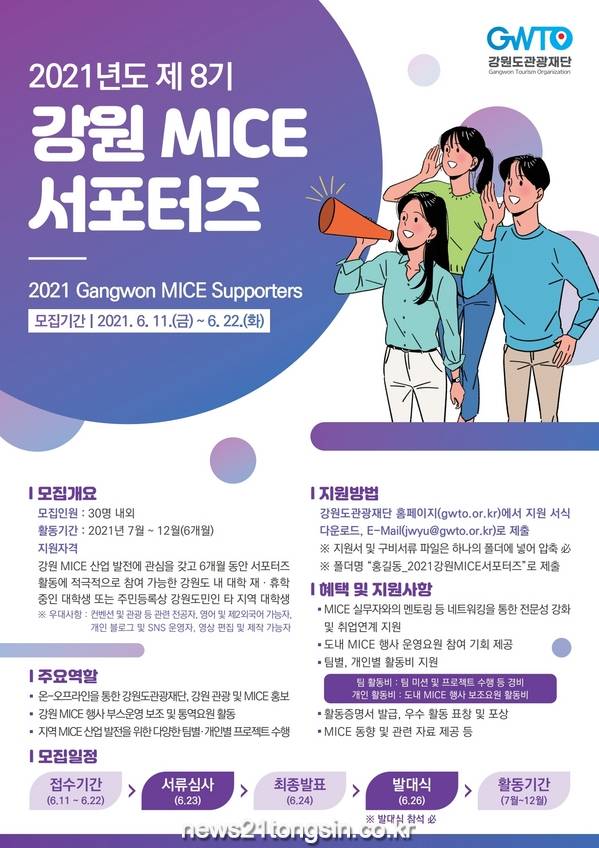 강원도관광재단(대표이사 강옥희)은 강원 MICE 산업의 발전과 미래 MICE 산업을 이끌어갈 인재를 육성하기 위하여 이번 달 22일까지 ‘제 8기 강원 MICE 서포터즈’를 모집한다고 17일 밝혔다.