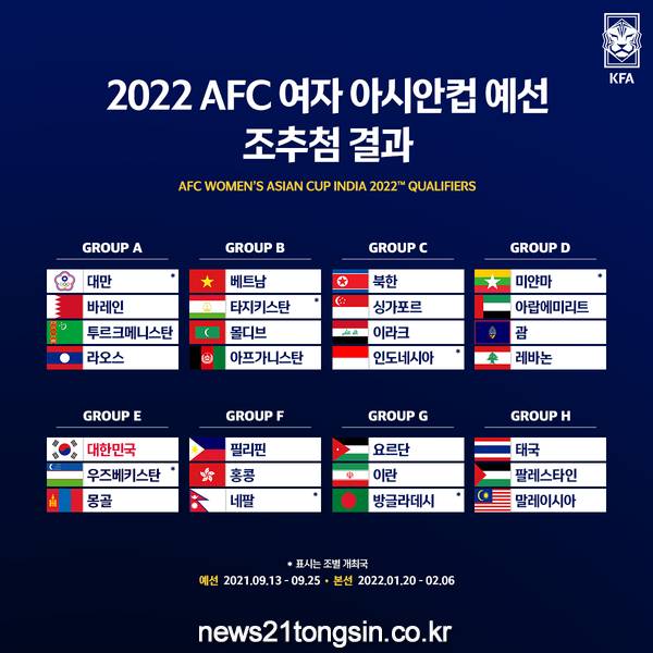 24일 KFA에 따르면 오후 말레이시아 쿠알라룸푸르에 위치한 AFC 하우스에서 2022 AFC 여자 아시안컵 에선 조 추첨식이 진행됐다. 한국은 우즈베키스탄, 몽골과 함께 E조에 편성됐다.