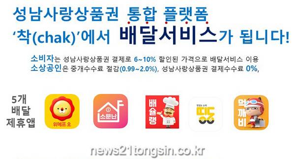 시는 착 배달서비스 확산을 위해 오는 8월 2일부터 예산(5000만원) 소진 때까지 5개 민간 배달앱에서 주문 뒤 모바일 성남사랑상품권으로 결제하는 고객에 5000원권의 모바일 할인 쿠폰을 제공하는 이벤트를 연다.
