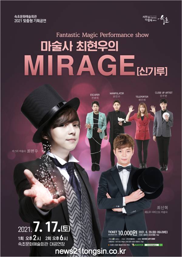 속초시가 7월 17일 토요일 오후 2시와 6시, 2회에 걸쳐 속초문화예술회관 대공연장에서 2021년 맞춤형 기획공연 Fantastic Magic Performance show『마술사 최현우의 MIRAGE (신기루)』를 개최한다.