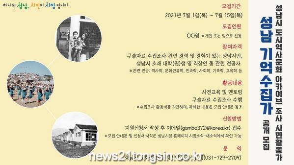 성남시(시장 은수미)는 도시역사문화 아카이브(archive, 자료보존소) 구축을 위해 수집 조사를 함께할 시민 활동가(성남 기억수집가)를 오는 7월 15일까지 공개 모집한다.