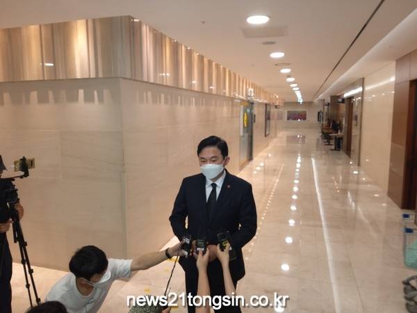 ▲ 원희룡 제주자치특별도지사가 9일 고 최영섭 대령의 빈소를 조문후 기자들의 질문에 답변을 하고 있다(사진=추현욱 기자)원희룡 제주특별자치도지사가 9일 15:21에 고 최영섭 대령의 빈소를 찾아 조문을 했다. 원 지사는 최재형 전 감사원장에게 위로의 말씀을 전했다라고 밝혔으며, 아울러 최 전 원장의 정치참여와 관련된 기자의 질문에 대해서는 "정권교체를 위해 '원팀'을 만드는 것에 크게 환영한다"라고 답했다.