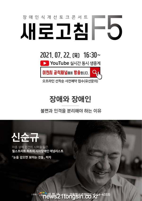 이천시(시장 엄태준)는 오는 7월 22일 오후 4시 30분에 장애인식개선 행사로 『새로고침(F5)』를 개최한다. 이번 행사는 이천시 공식 유튜브를 통해 실시간 방송할 예정이다.