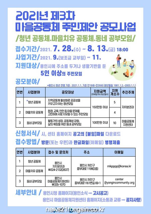 공모는 ▲청년 활동 지원을 위한 청년 공동체 5개팀 ▲마을 문제 해결을 위한 마을치유 공동체 4개팀 ▲마을에 대해 함께 공부하는 동네 공부모임 10개팀 등 총 3가지 분야에 19팀을 모집하고, 용인에 주소를 두거나 직장이나 학교 등 생활기반을 둔 5인 이상의 모임이면 각 분야에 맞는 사업을 자유롭게 제안하면 된다.