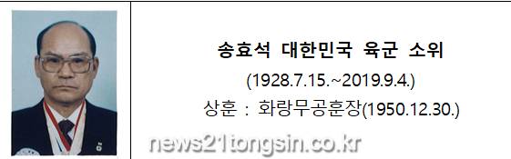 국가보훈처(처장 황기철)는 ‘2021년 8월의 6‧25 전쟁영웅’으로 송효석 육군 소위(1928. 7. 15. ~ 2019. 9. 4.)를 선정했다고 밝혔다.