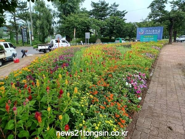속초시가 대포 농공단지 입구를 비롯한 주요 도로변에 백일홍, 메리골드 등 여 름꽃 25만 본 식재를 완료했다.