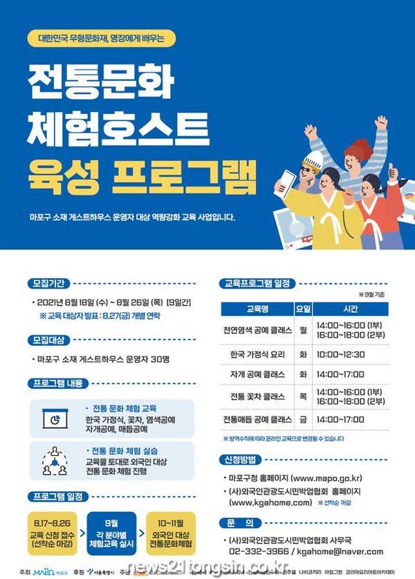 마포구(구청장 유동균)는 코로나19로 침체된 관광업계를 지원하고 마포만의 특색있는 전통문화체험이 가능한 게스트하우스 육성을 위해 「게스트하우스 전통문화체험사업」을 진행한다고 20일 밝혔다.