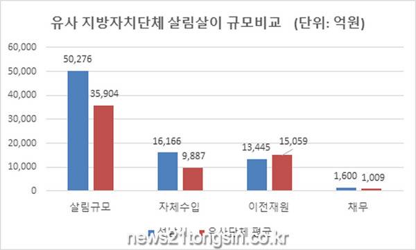 인구·재정 규모가 비슷한 화성·수원·고양·용인·부천 등 16곳 다른 지자체(이하 유사자치단체)의 재정 규모 평균이 3조5904억원인 것과 비교하면 40%(1조4372억원) 큰 규모다.