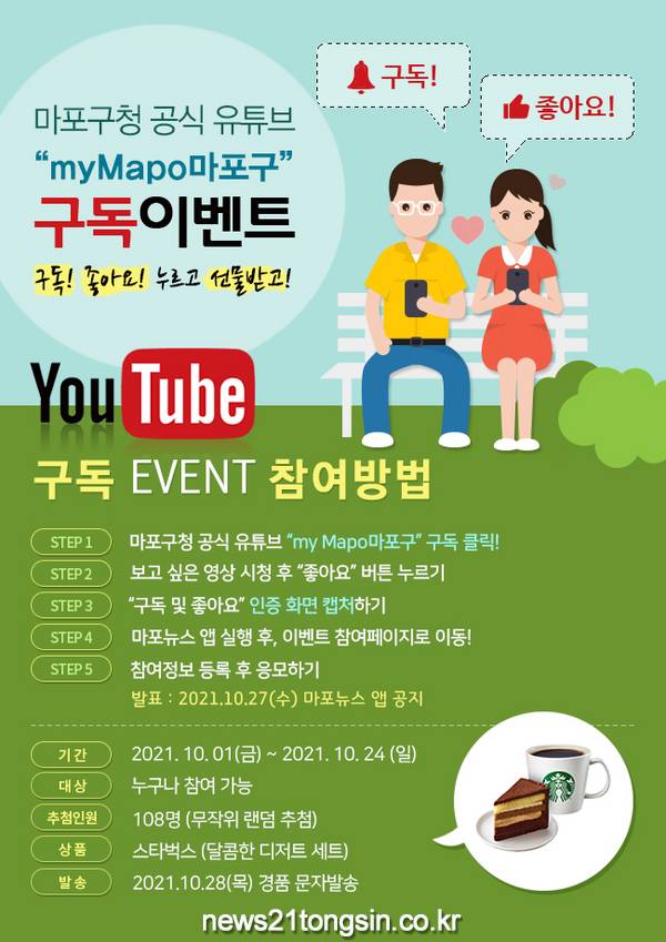 마포구(구청장 유동균)가 ‘마포TV’ 공식 유튜브 채널(my Mapo) 구독자와 ‘마포뉴스 앱(APP)’ 사용자를 위해 “구독&좋아요” 이벤트를 10월 24일까지 진행한다고 밝혔다.
