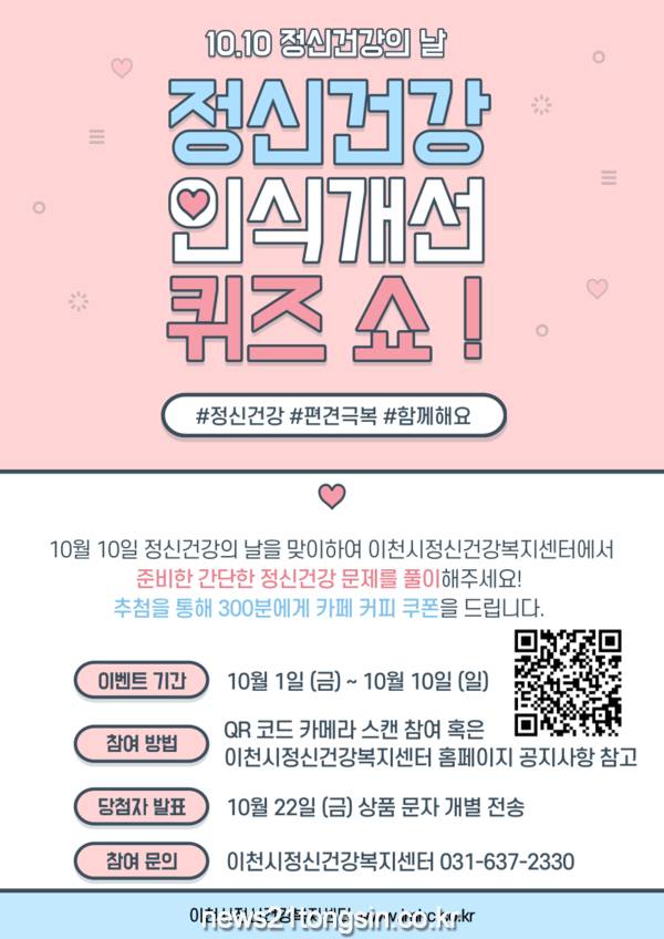 10월 1일부터 10일까지 이천시와 이천시정신건강복지센터에서는 ‘10월 10일 정신건강의 날’을 맞이하여 정신건강 인식개선 온라인 캠페인 ‘정신건강 인식개선 퀴즈쇼!’를 진행한다고 밝혔다.