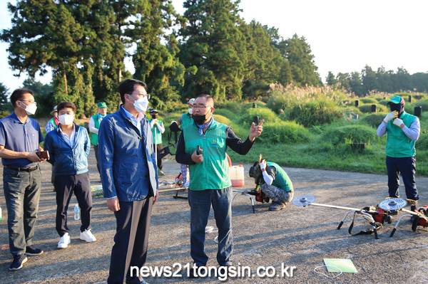 안동우 제주시장은 10월 8일 서부 공설 공원묘지를 찾아 미 벌초 분묘 봉사활동을 펼치고 있는 제주시 용담2동 새마을지도자협의회(회장 정성부)를 격려했다고 밝혔다.