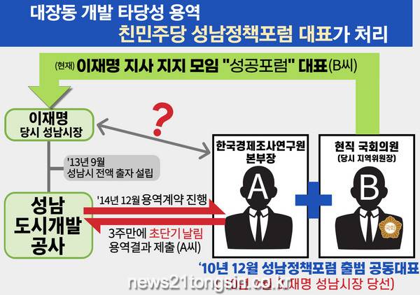 이후 최씨는 2013년 4월 24일 한국경제조사연구원의 총괄본부장인 성씨를 성남시의회 요직에 위촉(임기 2년)했고, 해당 연구원은 2014년 12월 31일부터 2015년 1월 22일까지 ‘타당성 평가 용역’을 단 3주만에 엉터리로 진행시켜 「대장동 개발사업 추진의 단초」를 제공했다.