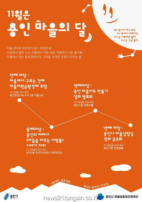오는 26일까지 매주 금요일 마을자원순환경제 포럼, 2021년 마을공동체 활동 공유회, 용인 마을지도 만들기 결과발표회, 2021년 용인시 마을실험실 성과공유회가 진행된다.