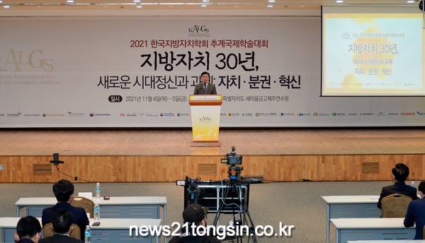 제주특별자치도는 4일 오후 1시 30분 새마을금고 제주연수원에서 제주특별자치도의회, 한국지방자치학회 등과 함께 지방자치 30년 새로운 시대정신과 자치·분권·혁신이라는 주제로 ‘2021 지방자치 발전포럼(한국지방자치학회 추계국제학술대회)’ 개회식을 개최했다.