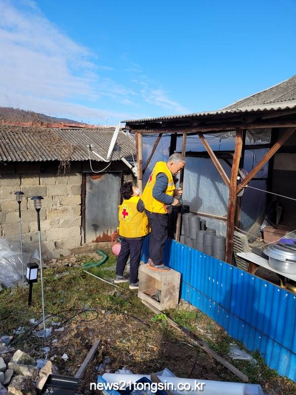 추운 날씨의 휴일임에도 불구하고 대한적십자 회원들은 이른 아침부터 방풍 비닐 설치 및 집 청소에 구슬땀을 흘렸다.
