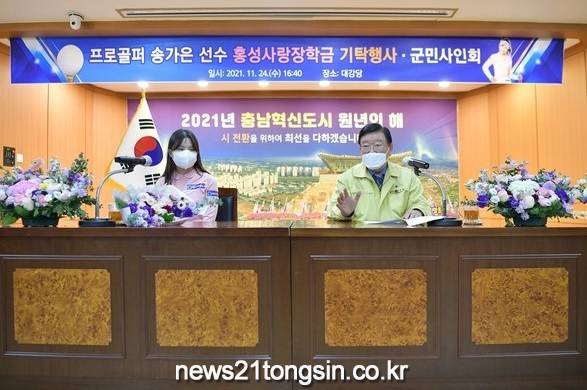 홍성군은 지난 24일 한국여자골프협회(KLPGA) ‘21시즌 신인왕 송가은 선수가 홍성군청을 방문해 장학금 기탁과 사인회 행사를 가지며 고향사랑을 몸소 실천했다고 밝혔다.