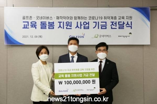 ▲  사진=골프존골프존은 사회복지법인 '굿네이버스'에 아동 보호시설 이용 청소년의 학습 결손 및 교육 격차 해소를 위해 기금 1억 원을 전달했다고 10일 밝혔다.