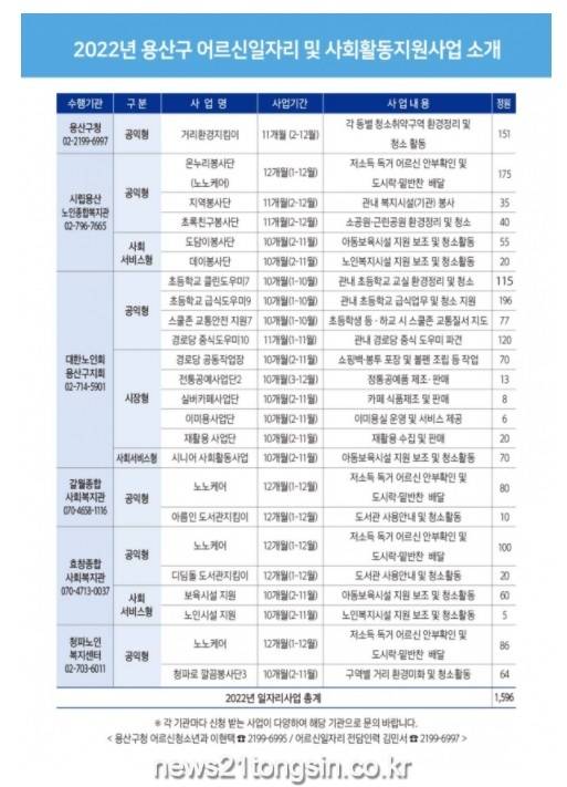 수행기관은 ▲용산구청(2199-6997) ▲시립용산노인종합복지관(796-7665) ▲대한노인회용산구지회(714-5901) ▲갈월종합사회복지관(070-4658-1116) ▲효창종합사회복지관(070-4713-0037) ▲청파노인복지센터(02-703-6011)다.
