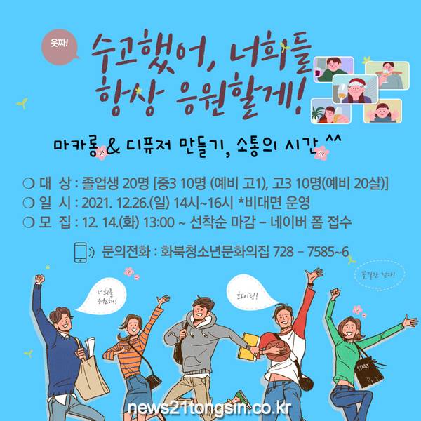 ▲  사진=제주시 제주시는 오는 26일 중등 3학년, 고등 3학년 청소년 대상 화북청소년문화의집 ‘수고했어, 너희들 – 항상 응원할게!’프로그램을 운영할 계획이라고 밝혔다.