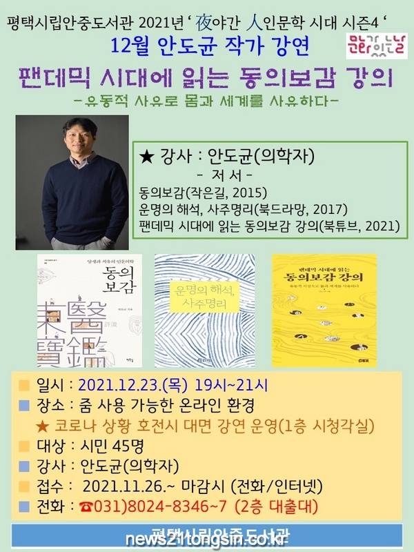 ▲ 사진=평택시평택시립안중도서관은 2021년 12월 야간인문학 안도균 작가의 <팬데믹 시대에 읽는 동의보감 강의>를 운영한다.