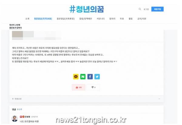 22일 윤 후보의 실언이 나온 뒤 홍 의원이 운영하는 온라인 플랫폼 '청년의 꿈'에 한 이용자가 “후보라는 사람이 계속 망언을 하는데 어떻게 보시나요?”라며 묻자 홍 의원은 이같은 짧은 답글을 달았다. 윤 후보의 반복되는 실언에 더 이상 대책이 없어보인다는 의미로 읽히는 부분이다.